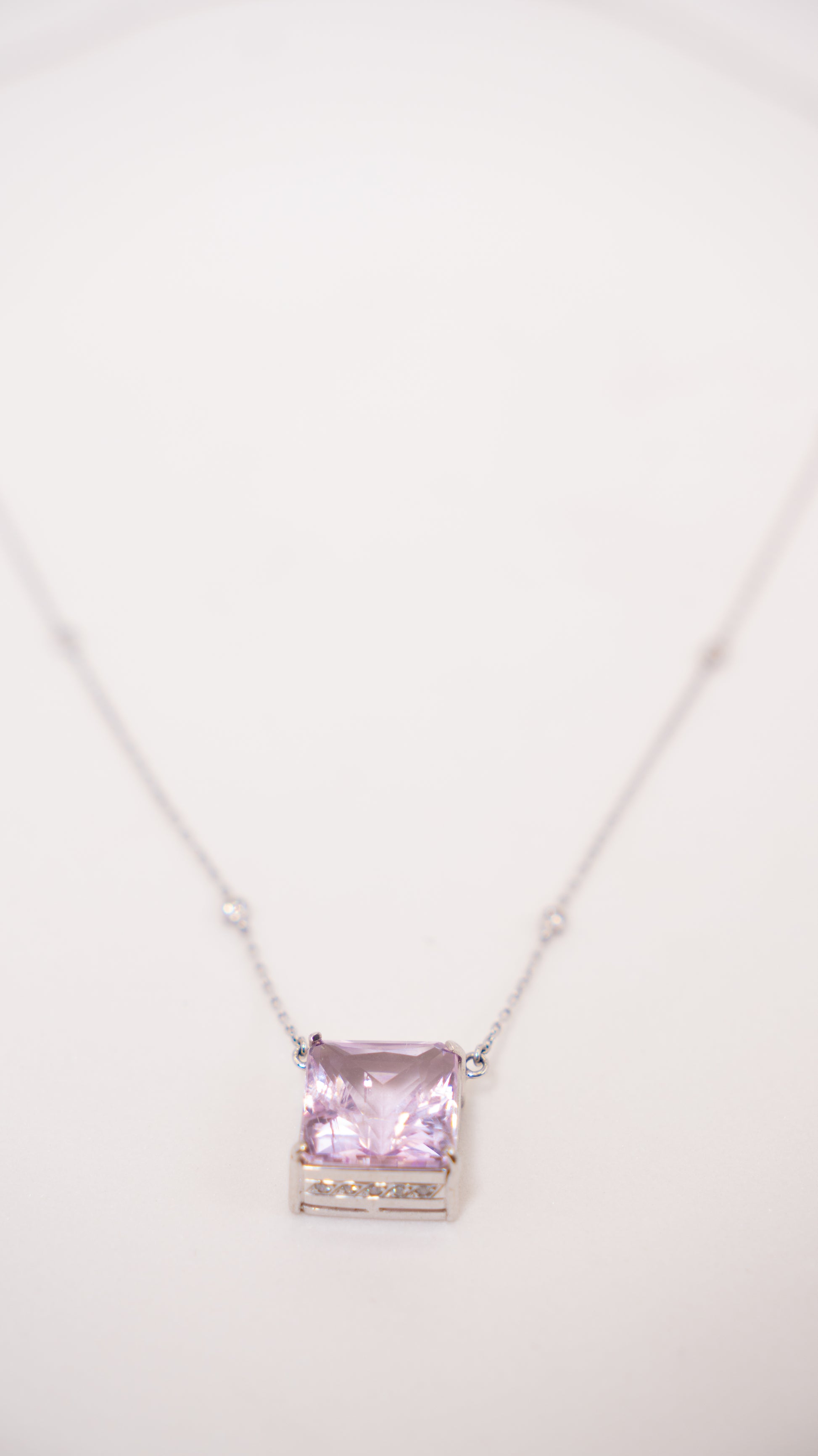 A Colar Star é mais que um acessório: é uma expressão de estilo e significado. Produzida artesanalmente em ouro branco 18k, diamante e kunzita, unindo beleza e durabilidade incomparáveis.